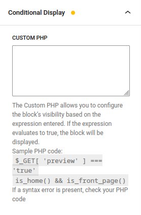 When using Stackable we can create blocks that have “Conditional Display” options, which allow us to either display or hide a block based on condition matching. Now, the default condition types don’t really solve the specific problem we have: they include stuff like “Login Status”, “Role”, “Date & Time”, etc. However, there is also an option to use “Custom PHP” for this.