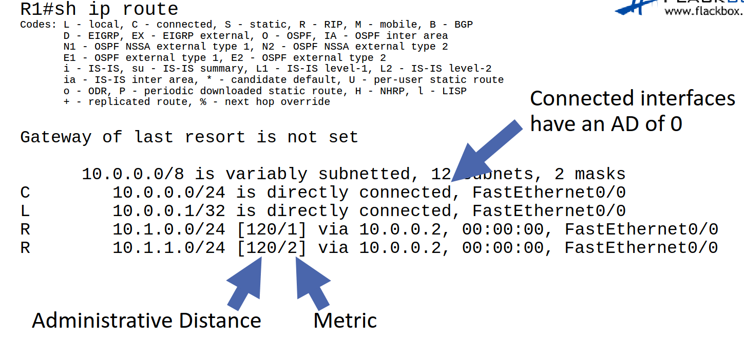 When using sh ip route we can see the administrative distance values assigned to each route in the Routing Table: