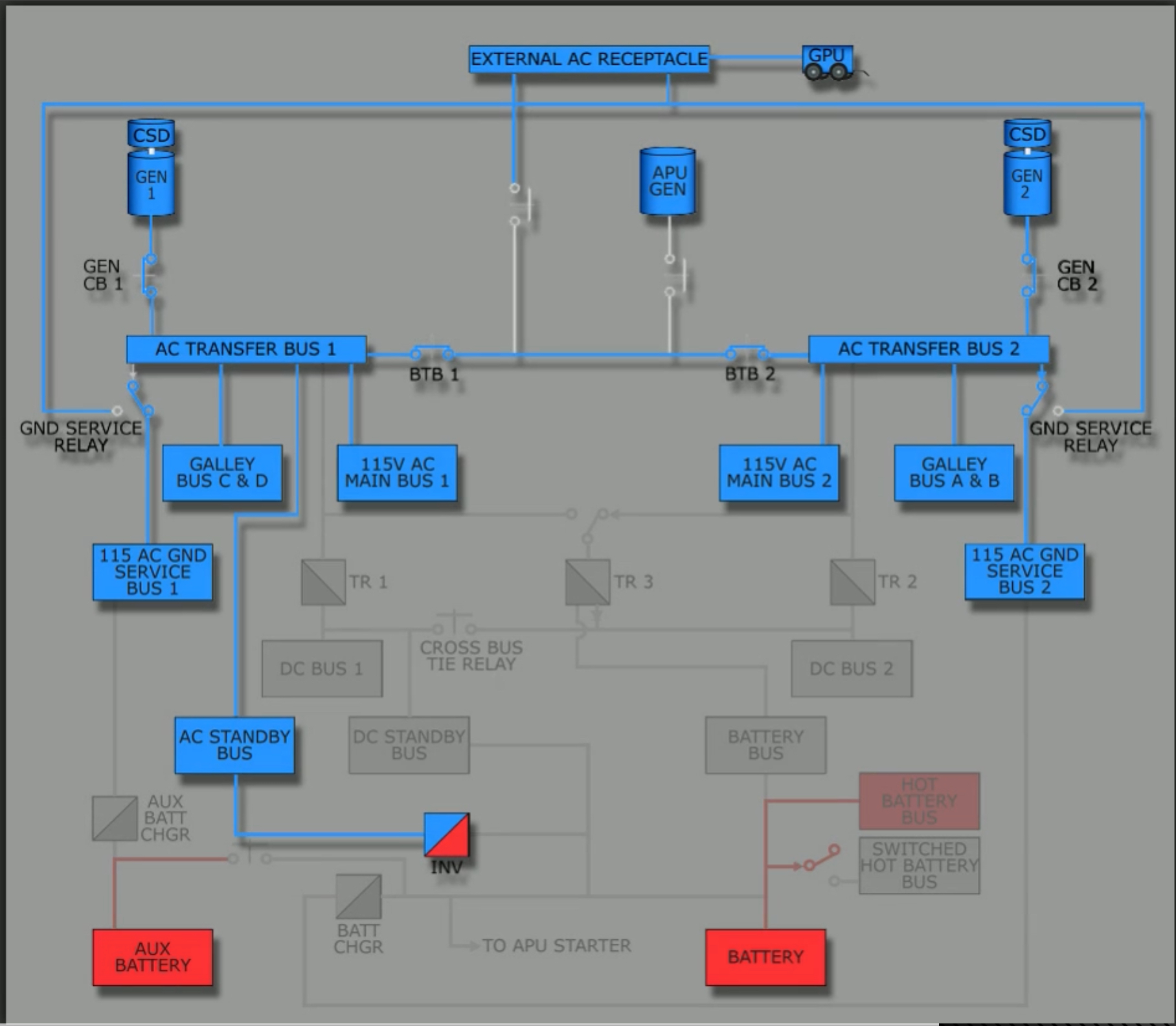 DC Bus 1, 2 and the DC Standby bus are connected via the Cross Bus Tie Relay. During most segments, the relay is closed, connecting the busses. This leads to the normal TR operating condition.