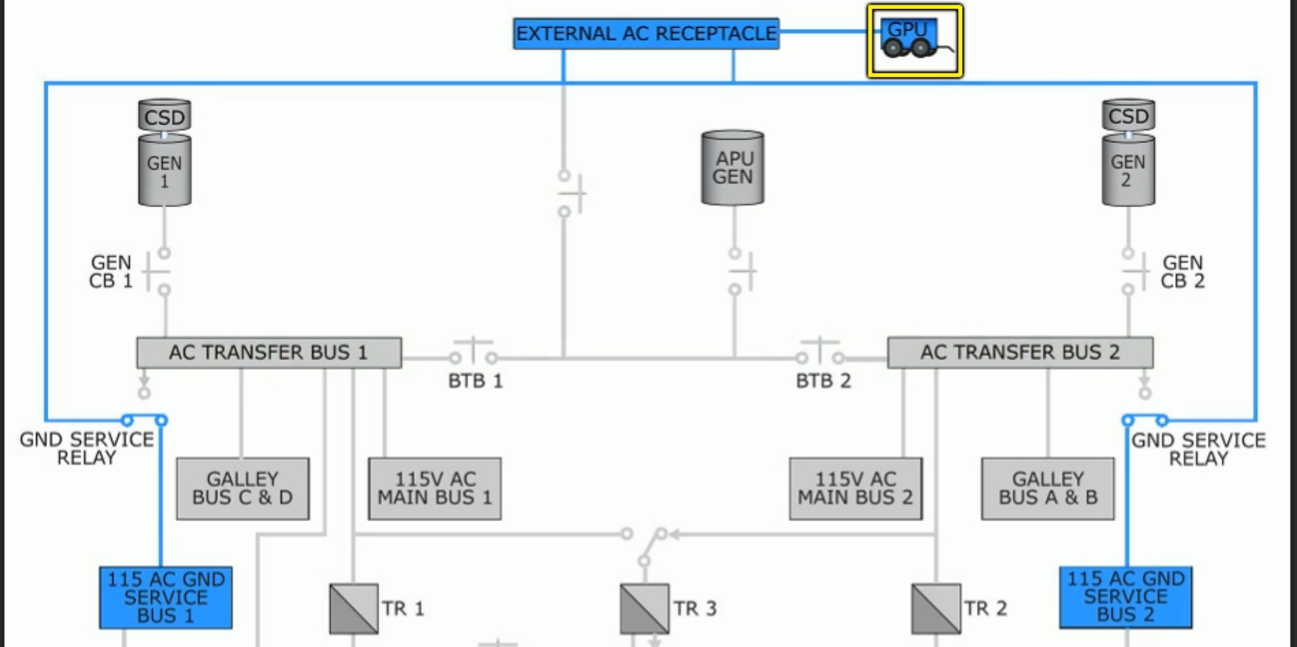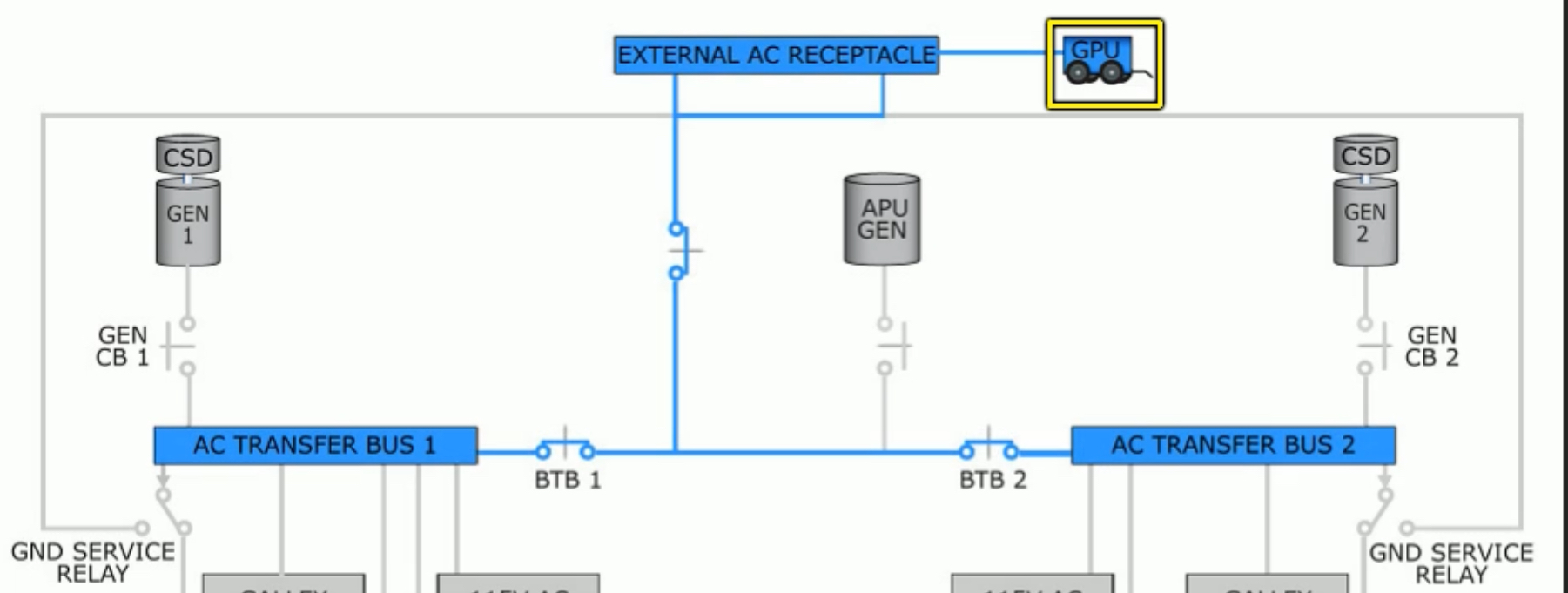On the ground, electrical power can be supplied by an external source to allow the APU and engines to remain off. The GPU provides 115v AC electrical power to both AC Transfer Busses through bus tie breakers (BTB).