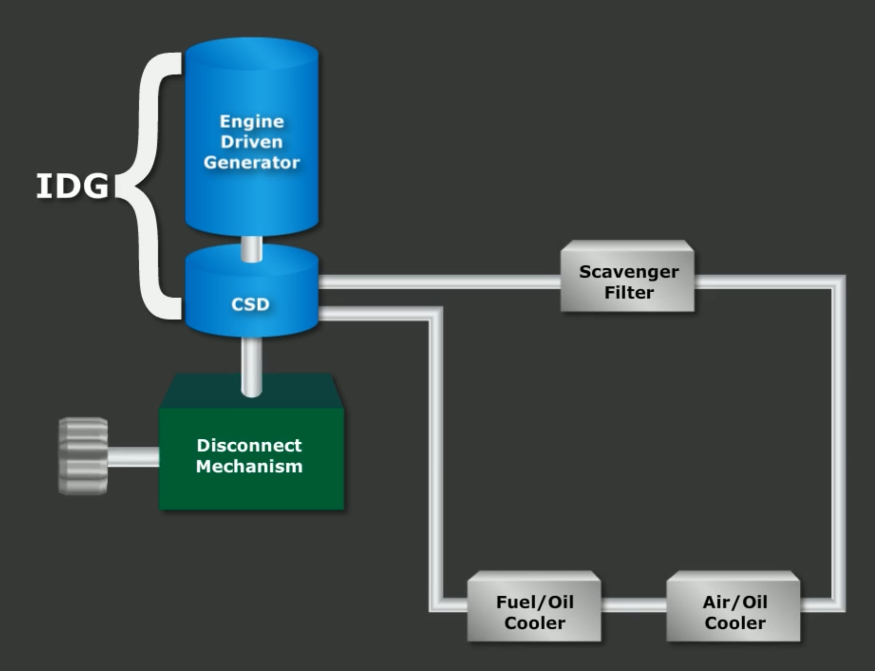 The IDG internal oil system is used not only in the CSD, but also for cooling and lubricating the IDG itself. The oil is routed to an air/oil heat exchanger located in the fan section of the engine before entering the IDG Oil Cooler where it uses fuel to decrease temperature.