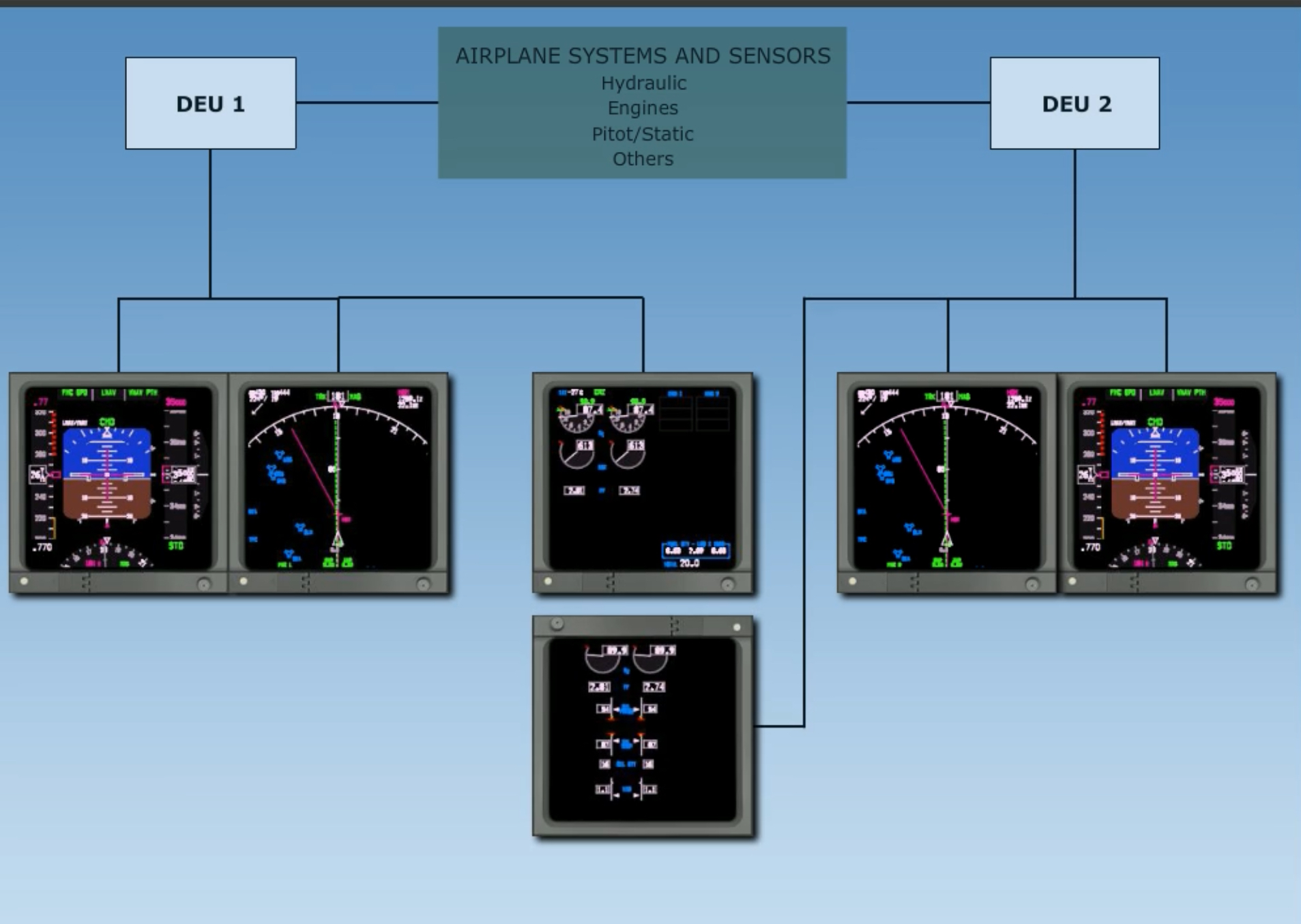 Should either DEU fail, the other DEU will automatically control the other side. It allows all displays to use a single DEU source. *Note that while operating on a single DEU, each pilot still receives information from independent sources and both ADIRUs..