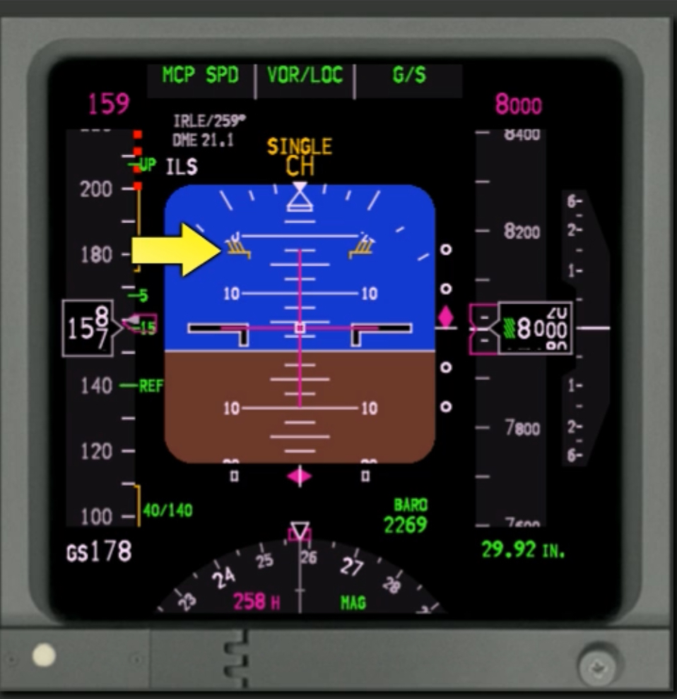 In addition to standard data, the ADIs also provide Pitch Limit Indications that indicate the maximum pitch limit for the current configuration. Going beyond the PLI results in stick shaker activation, and is displayed when the flaps are not up or at slow speeds with the flaps up.