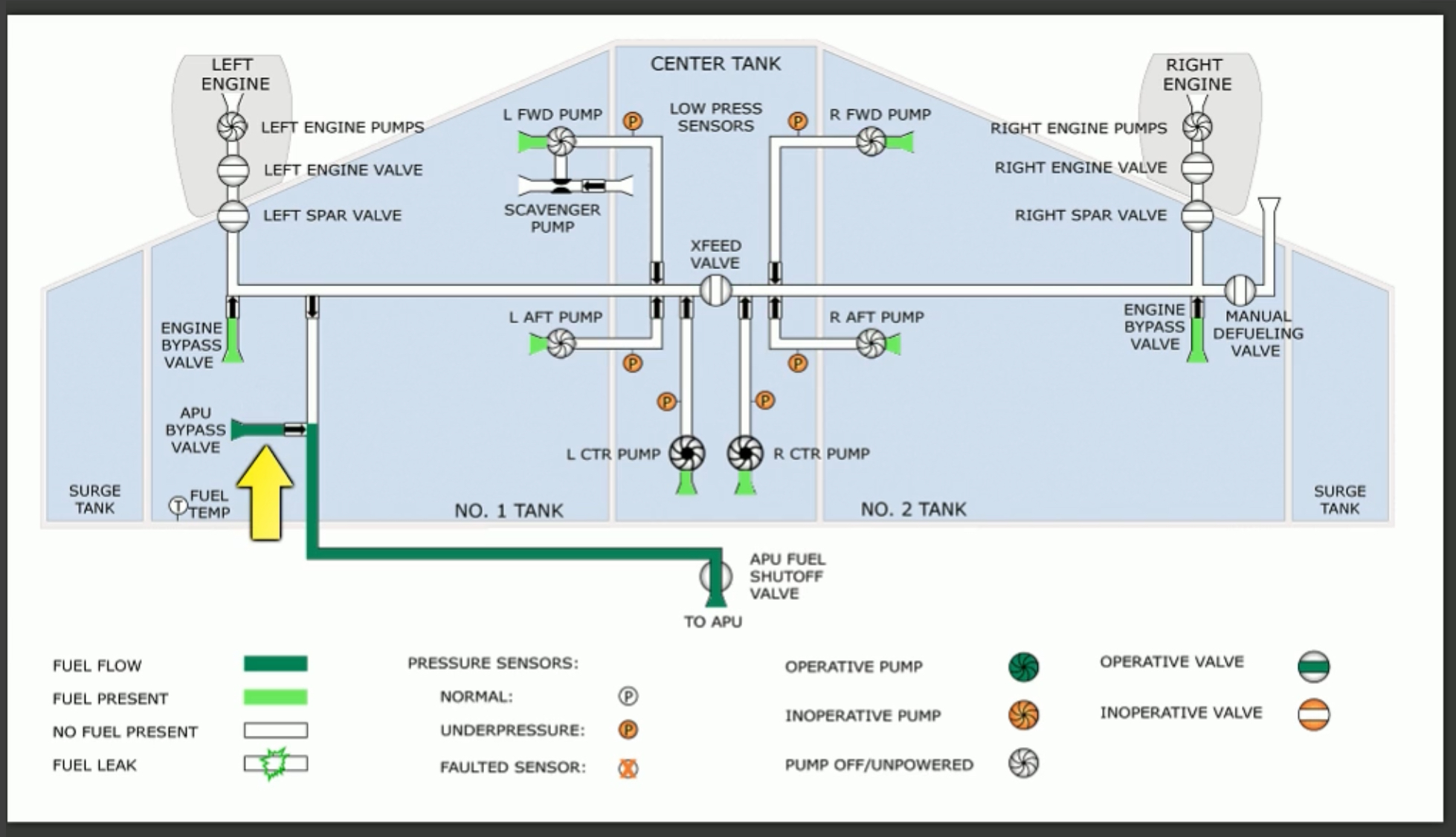 Each tank contains two AC powered pumps, and they feed fuel directly to the engines and the APU. The system is divided into a left side and a right side, connected by a XFEED valve.