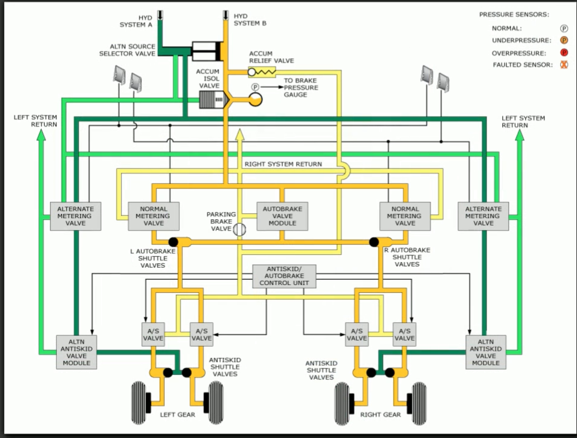 Additionally, should both hydraulic systems fail, you can get several brake applications or one parking brake application from trapped hydraulic pressure in the accumulators. This also means that the auto-brake system is inoperative.