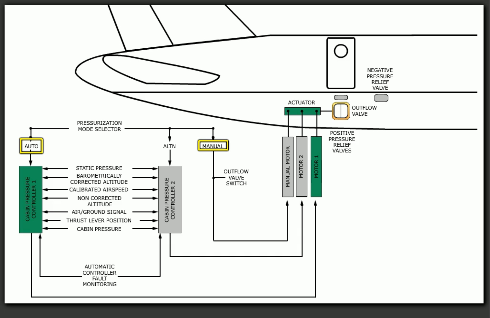 Each of the cabin pressure controller directly controls a DC powered motor to independently overate the outflow valve. Should the cabin altitude exceed 14,000 ft the DC powered motors automatically close the outflow valve.