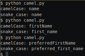 Week 2 of CS50 Python’s problem sets starts with a program called camelCase, wherein the program will ask the user for a name (in camel case) and output the corresponding name in snake_case.