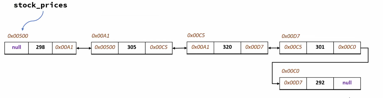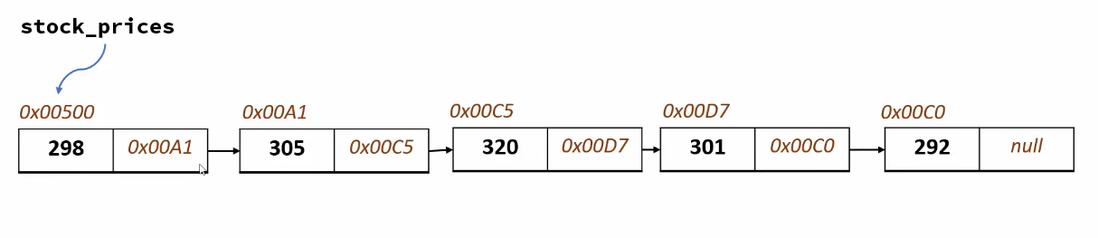 Unlike arrays, linked lists store data in different areas of memory, each linked by a pointer. The structure of each element will be the bytes allocated to the stored value, plus a pointer to a different memory location for the next element: