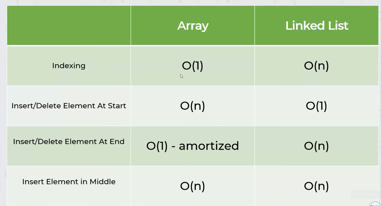 The Big-O advantages of a linked-list over arrays in terms of insertions and deletions isn’t great. The true benefit is not having to pre-allocate memory space and the simplicity of the insertion/deletion operation.