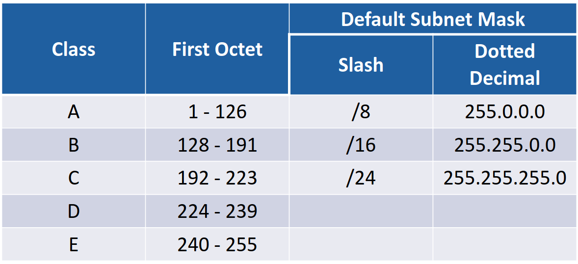 0, and default subnet mask is/8(first octet). Valid network addresses from1.0.0.0to126.0.0.0/8These IP addresses are assigned to networks with very large numbers of hosts. To accomplish this, the higher order bit (that is, the first bit in the address) is always set to