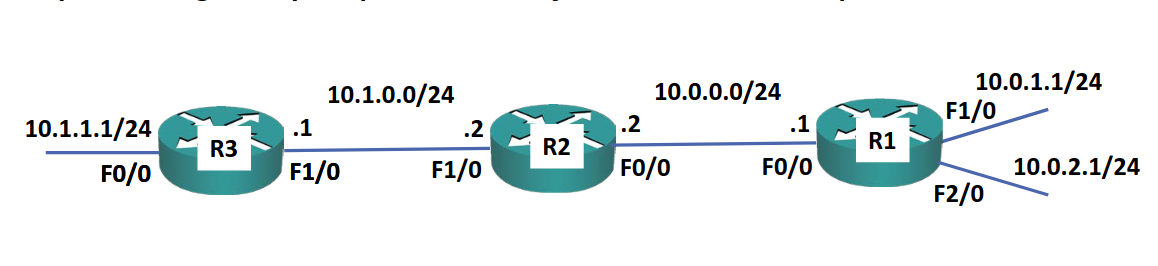 Assuming the above configuration, we advertise the 10.0.0.0/16 summary route out the left side of R1 - summarized to cover all the routes to the right. Note that R3 will only learn the summary - it simply knows that access to 10.0.0.0/24 is via R2.