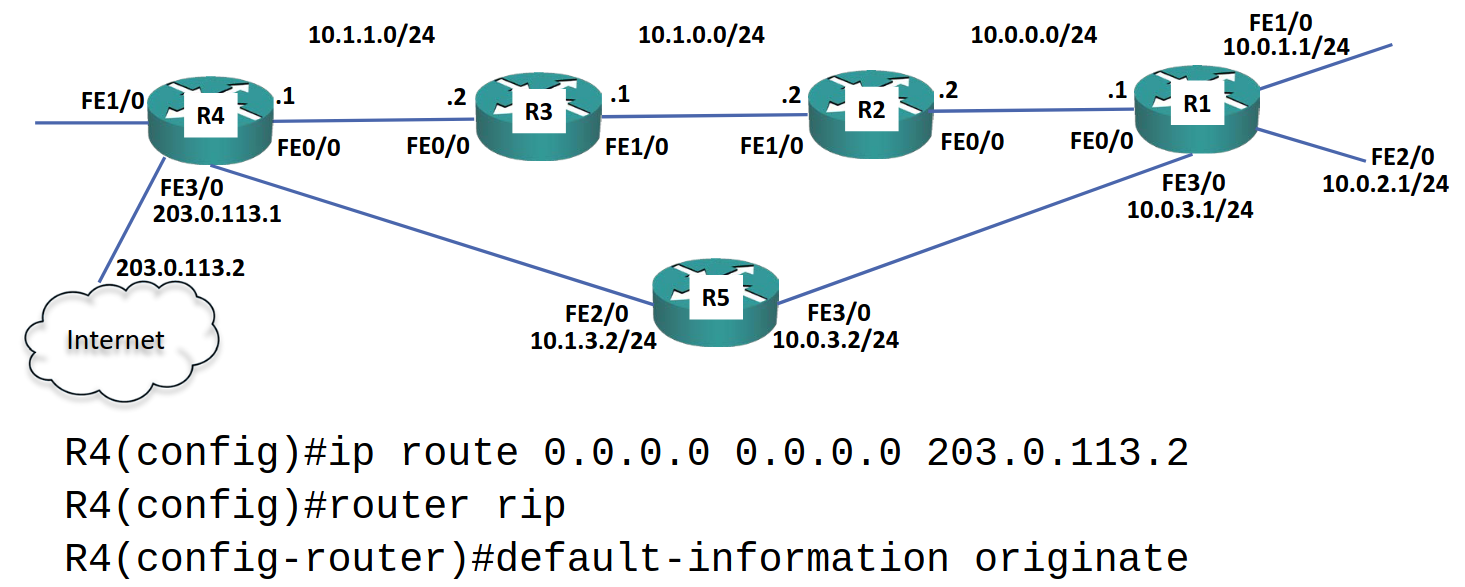 Suppose we have a router, R4 connected to the internet on FE3/0 and to internal networks on FE0/0. We use the command (from global config) ip route 0.0.0.0 0.0.0.0 <WAN IP address> (this is a default Static Routes). Once that is set, we want to inject the route into RIP by entering router ip and then default-information originate