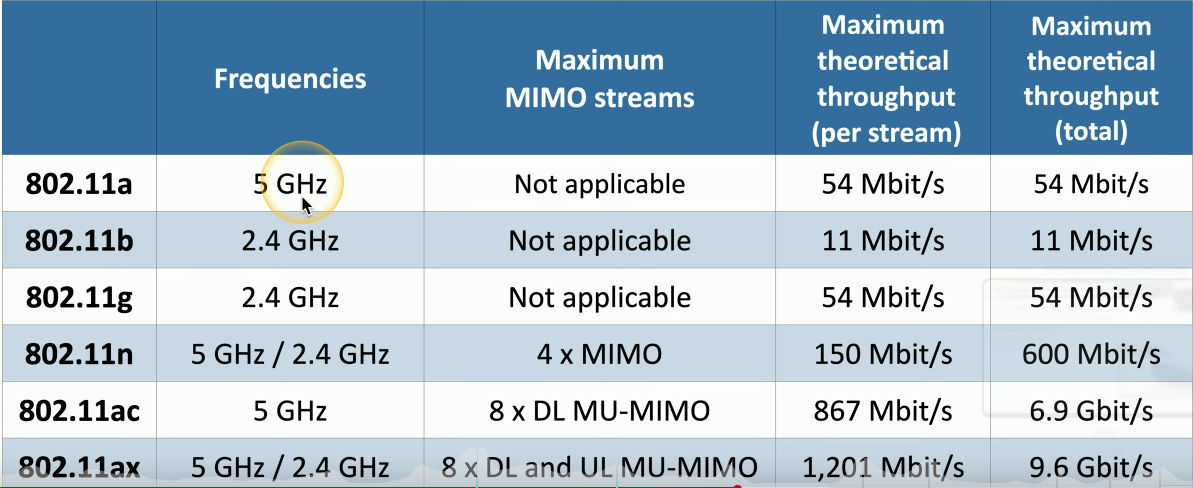 This is one of the first wireless standards, released in 1999. It operates only in 5 Ghz range (or others with special licenses).